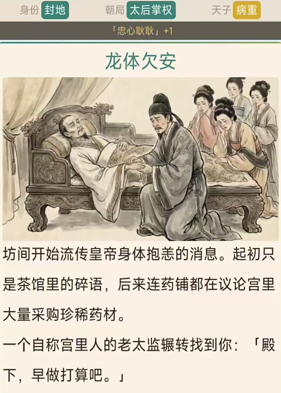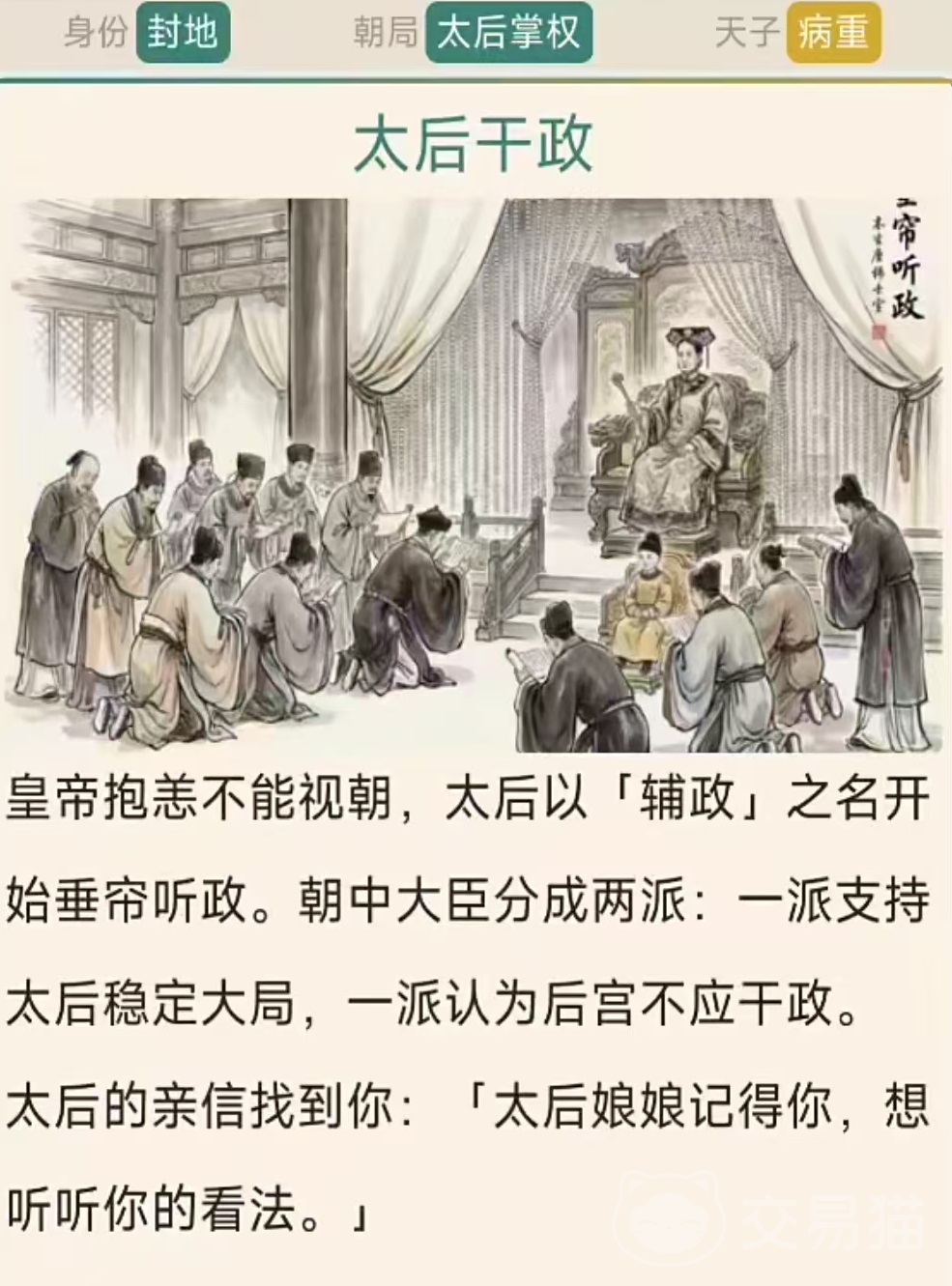 游戏采用文字叙事+静态插画的表现形式,节奏舒缓但逻辑严密。所有关键节点均设置多重选项,不同组合将导向截然不同的历史走向——可能是垂拱而治的盛世明君,也可能是退隐山林的逍遥散人;可能是被权臣架空的傀儡天子,也可能是力挽狂澜的中兴之主。全结局数量达数十种,需通过反复推演、策略试错方可逐一解锁。