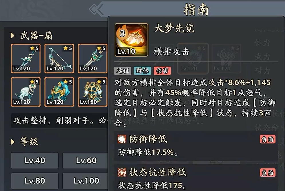 功能型减益专精者。核心技“大梦先觉”同步削弱敌方防御力与状态抗性,并有概率削减目标1点怒气值。双重压制效果使其成为副本攻坚与竞技压制中不可或缺的战术辅助位。