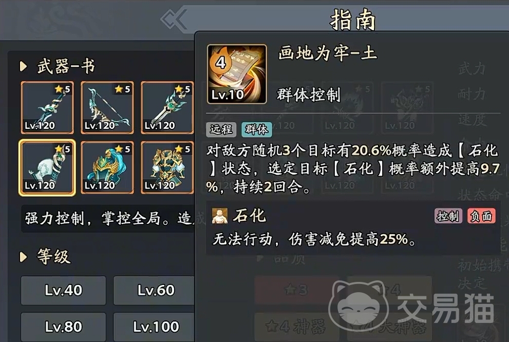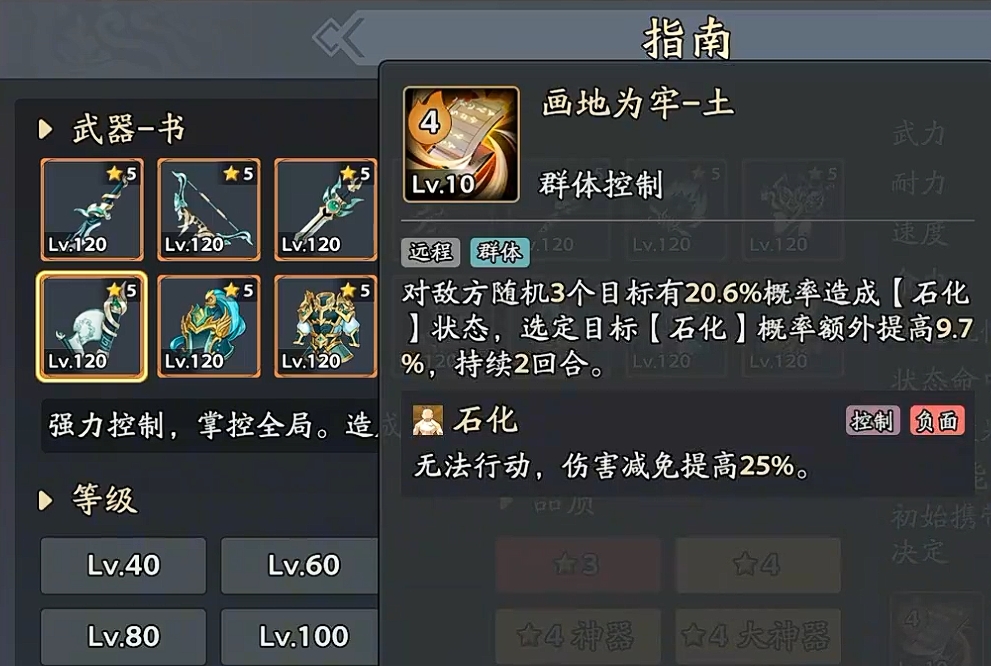 强控节奏掌控者。技能“画地为牢”随机选取敌方3名单位,施加石化状态。处于石化中的目标无法移动、攻击、释放技能或触发任何被动效果,控制时效内完全丧失作战能力,适用于打断关键技能、限制核心输出或创造集火窗口。