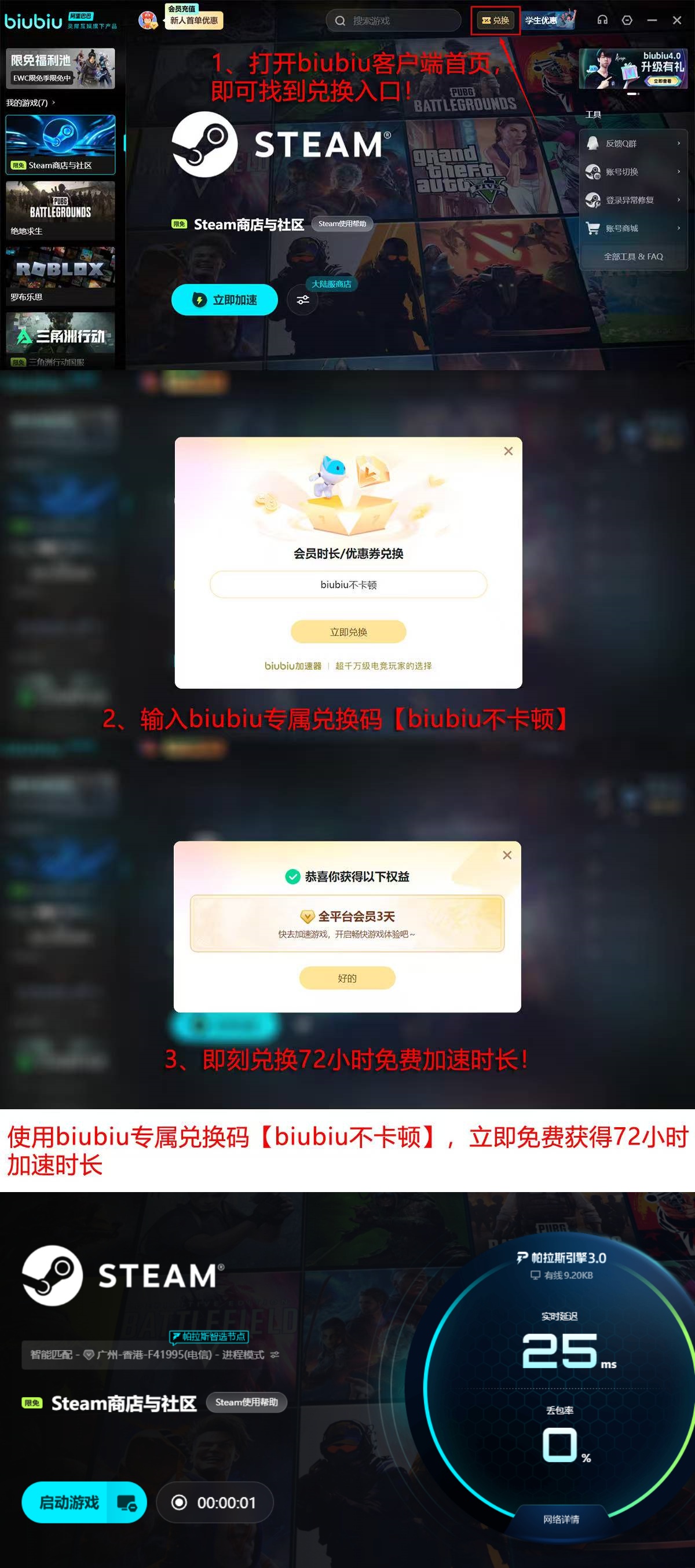 针对新用户,平台提供首登即享24小时免费加速时长的入门权益。若需延长体验周期,可输入兑换码【biubiu不卡顿】,额外激活3天全功能加速服务,无需绑定支付方式即可立即启用。