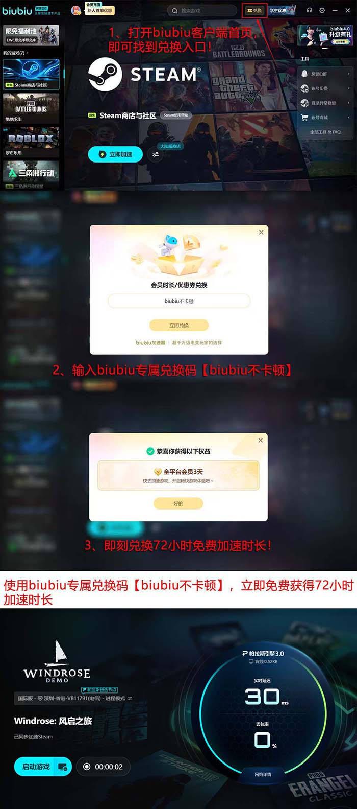 为保障《风启之旅》试玩及后续正式体验质量,用户可通过以下方式获取biubiu加速器免费使用时长:完成注册后系统自动发放24小时;登录后进入首页“兑换”入口,输入口令【biubiu不卡顿】,即可额外获得72小时,累计达96小时。该时段覆盖完整试玩周期,便于玩家对比不同网络状态下的操作流畅度、画面加载速度及多人交互稳定性。