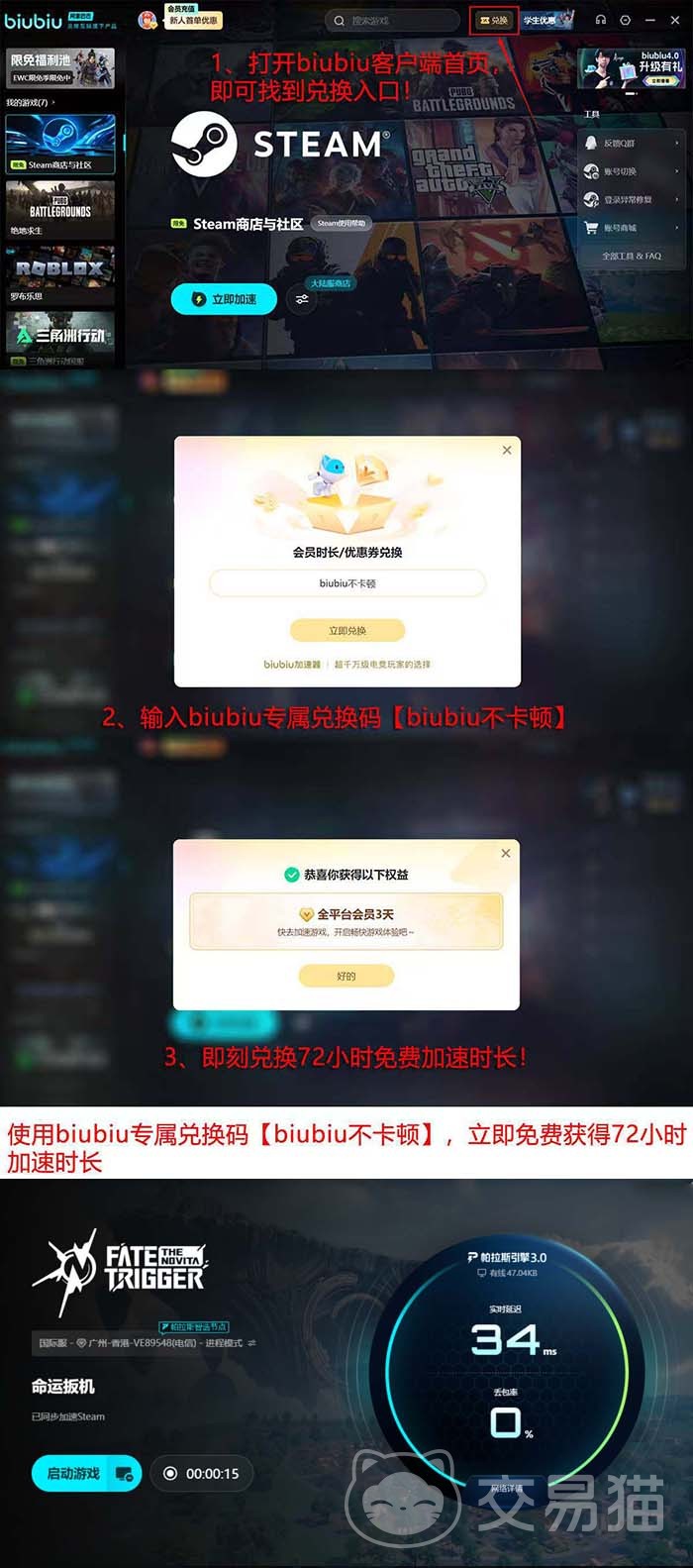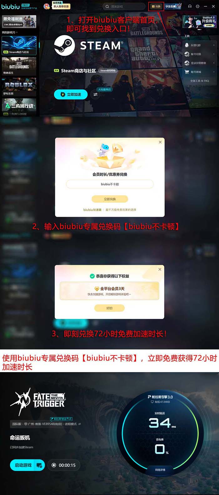 对于正在参与《命运扳机》试玩的玩家而言,如遇联机卡顿、匹配失败或频繁掉线等问题,可优先尝试部署biubiu加速器。新用户注册后可获赠24小时免费使用时长;登录首页进入“兑换”页面,输入口令【biubiu不卡顿】,即可额外获得72小时服务权限,累计可用时间为96小时。