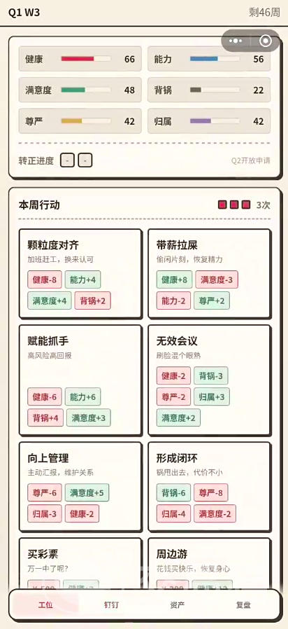 此外,游戏特别设计了行为识别逻辑:过度重复单一操作(如长期挂机刷会议)将触发管理层关注提示,进而降低晋升概率。真正的职场进阶,需要在效率、策略与风险控制之间持续寻找平衡点。