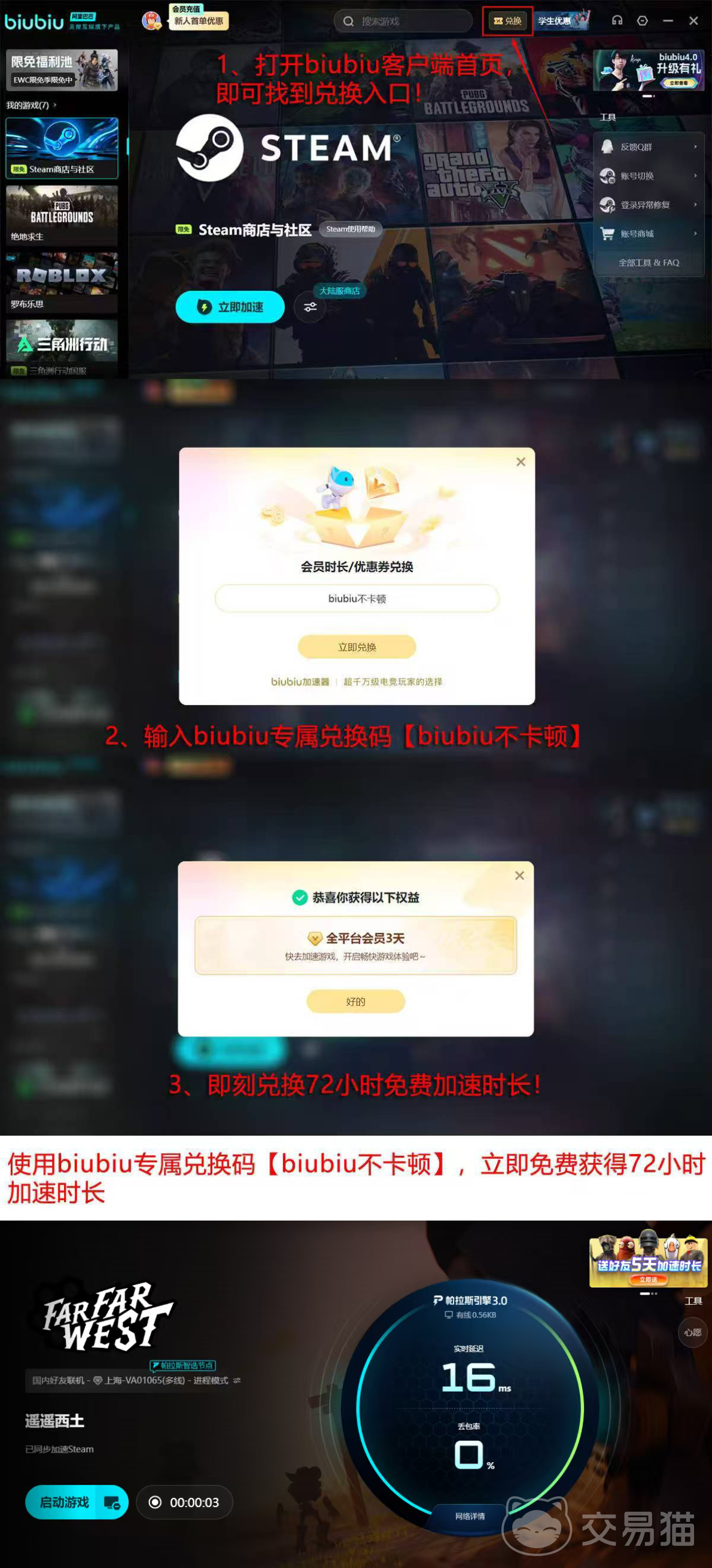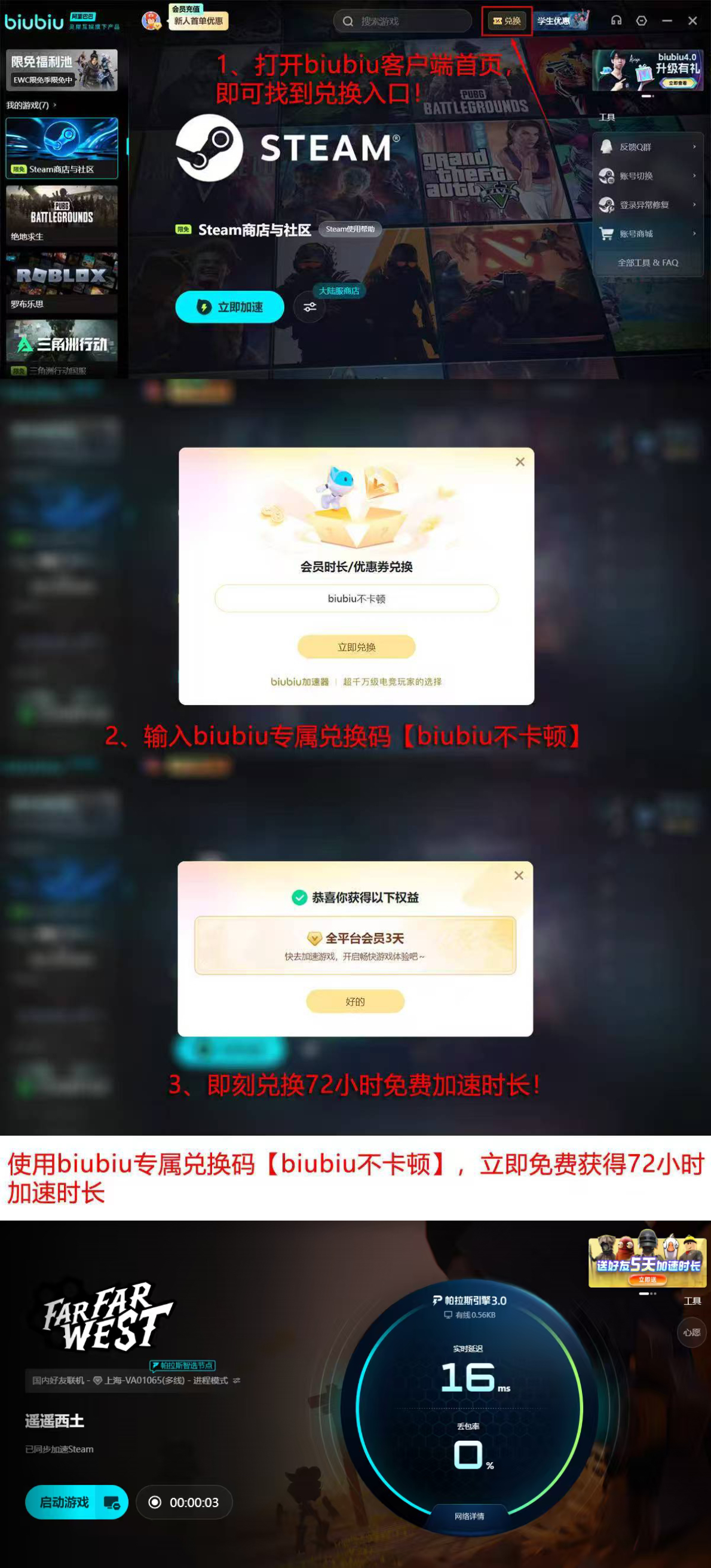 该加速器在性能表现、功能设计与用户权益方面均体现出较强针对性:其底层采用自研帕拉斯3.0引擎,保障连接稳定性与数据传输效率;签约代言人XDD小叮当,兼具职业电竞选手(PUBG全球冠军)与头部游戏主播双重身份,增强产品公信力;新用户注册即可获赠24小时免费加速时长,叠加输入兑换码【biubiu不卡顿】还可额外领取72小时,总计96小时免费服务,完整覆盖Far Far West抢先体验初期的全流程体验周期。