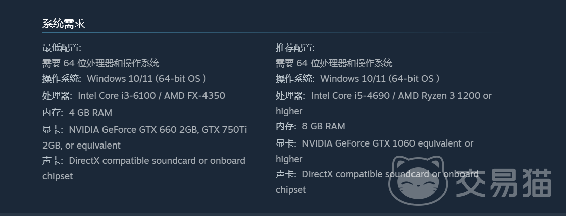 本作对硬件要求极为友好,属于轻量级PC游戏范畴。官方推荐配置为:操作系统需Windows 10或Windows 11;处理器不低于Intel Core i3-6100;运行内存至少4GB;显卡需NVIDIA GeForce GTX 660(显存2GB)或同级AMD产品;安装所需磁盘空间约为5GB。绝大多数近五年主流笔记本及台式机均可稳定运行,无明显卡顿或加载延迟。
