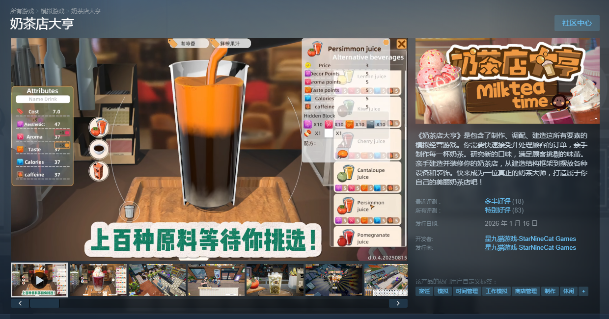 综上所述,《奶茶店大亨》已于2026年1月26日正式发售。其兼具策略性、趣味性与现实映射感的玩法设计,不仅适合模拟经营爱好者,也适合作为了解实体奶茶行业运作逻辑的入门实践工具。若你渴望在低风险环境中锤炼商业直觉与执行能力,这款游戏无疑是值得入手的优质选择。