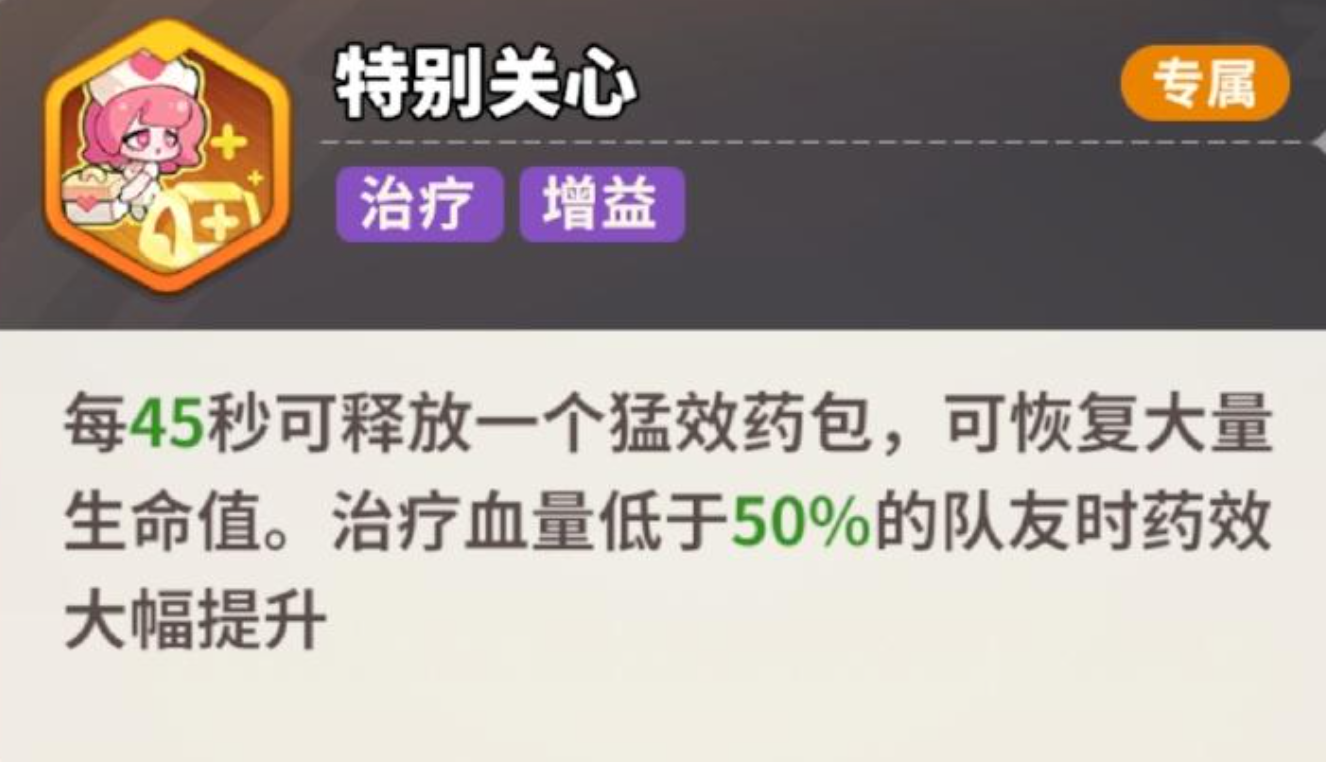 核心技能“特别关心”是其战术支点:每45秒可释放一次定向强效治疗,单次恢复量可观;当受疗目标生命值低于50%时,治疗效果提升至150%。该机制赋予她极强的残局干预能力,尤其适合搭配高承伤前排,在对方集火即将击溃关键单位时完成极限救场。相较持续铺垫型辅助,甜心护士更强调“临界响应”,以精准时机控制扭转战局走向,并同步维持全队输出效率。