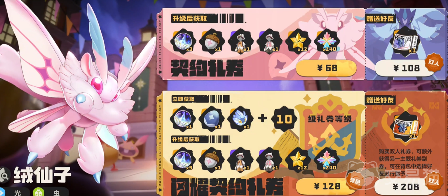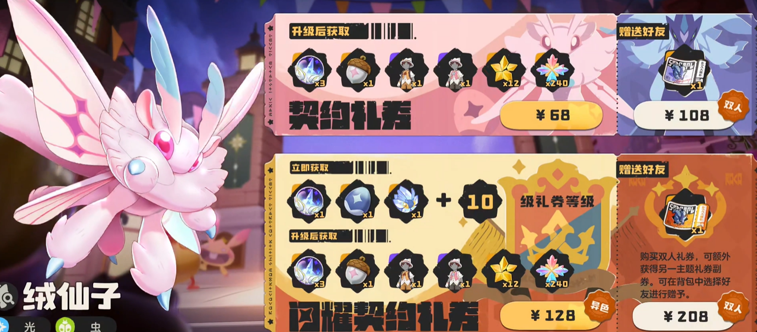 第一类付费项目为礼券系统,即赛季通行证机制。当前版本提供两种档位:普通礼券售价68元,闪耀礼券售价128元。每期礼券均绑定两个限定主题精灵,玩家需在二者中择一获取。需注意的是,购买后仅获得对应精灵的“果实”,须将其置于野外庇护所,待该精灵在指定区域刷新后方可进行捕捉,流程具有阶段性,不可即时领取。