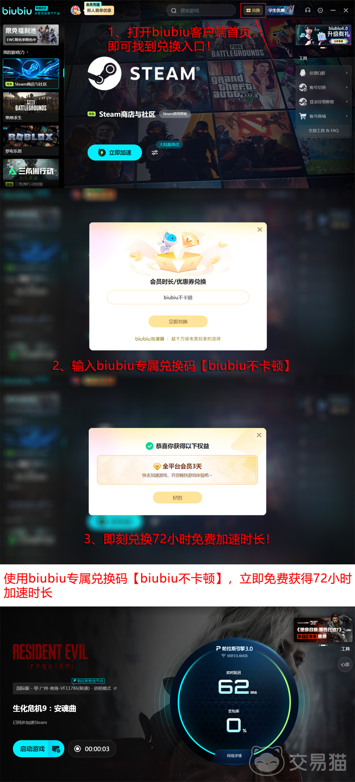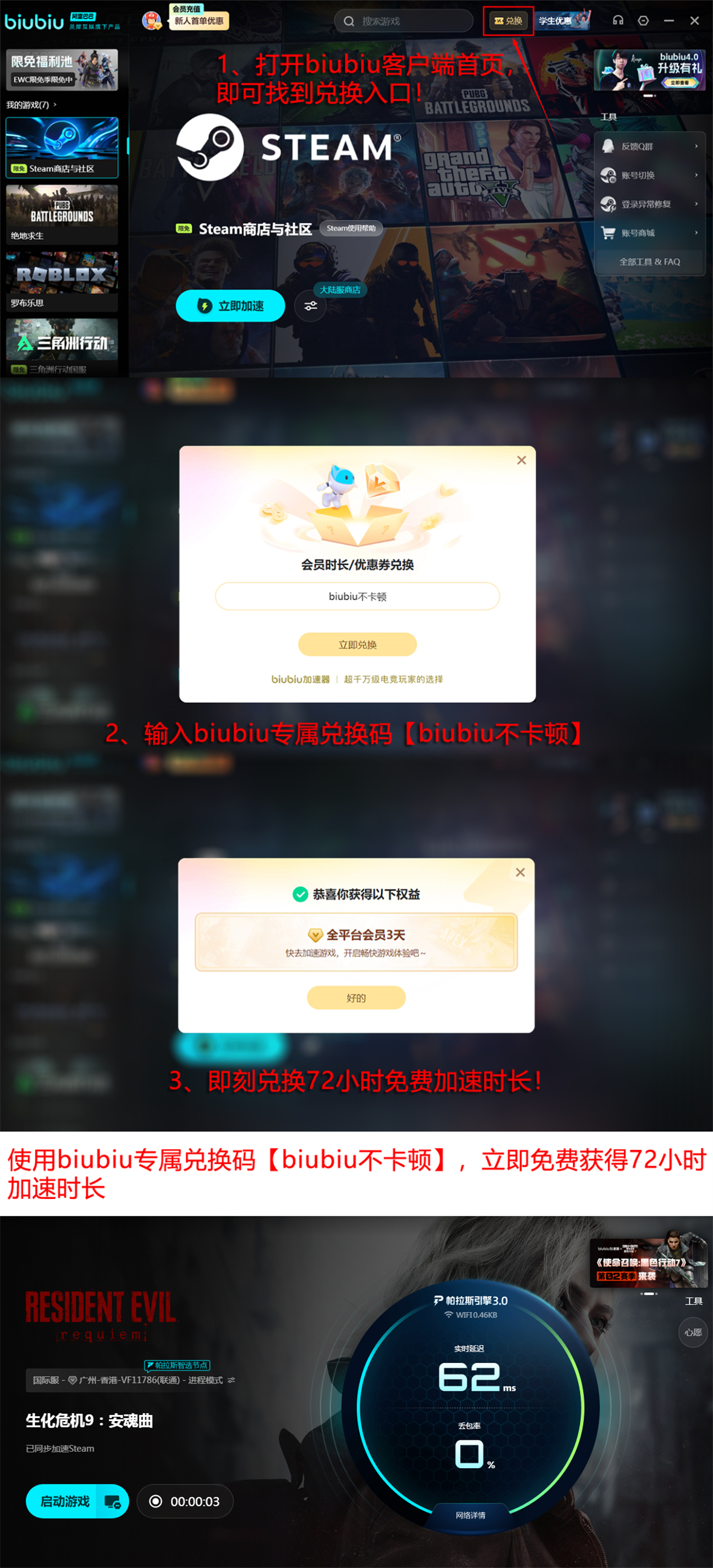 用户福利方面,所有账号均可使用一次专属兑换码【biubiu不卡顿】,兑换72小时连续加速服务;新注册用户还可额外获得24小时免费加速时长。两项权益可叠加使用,总计达96小时有效加速权限。