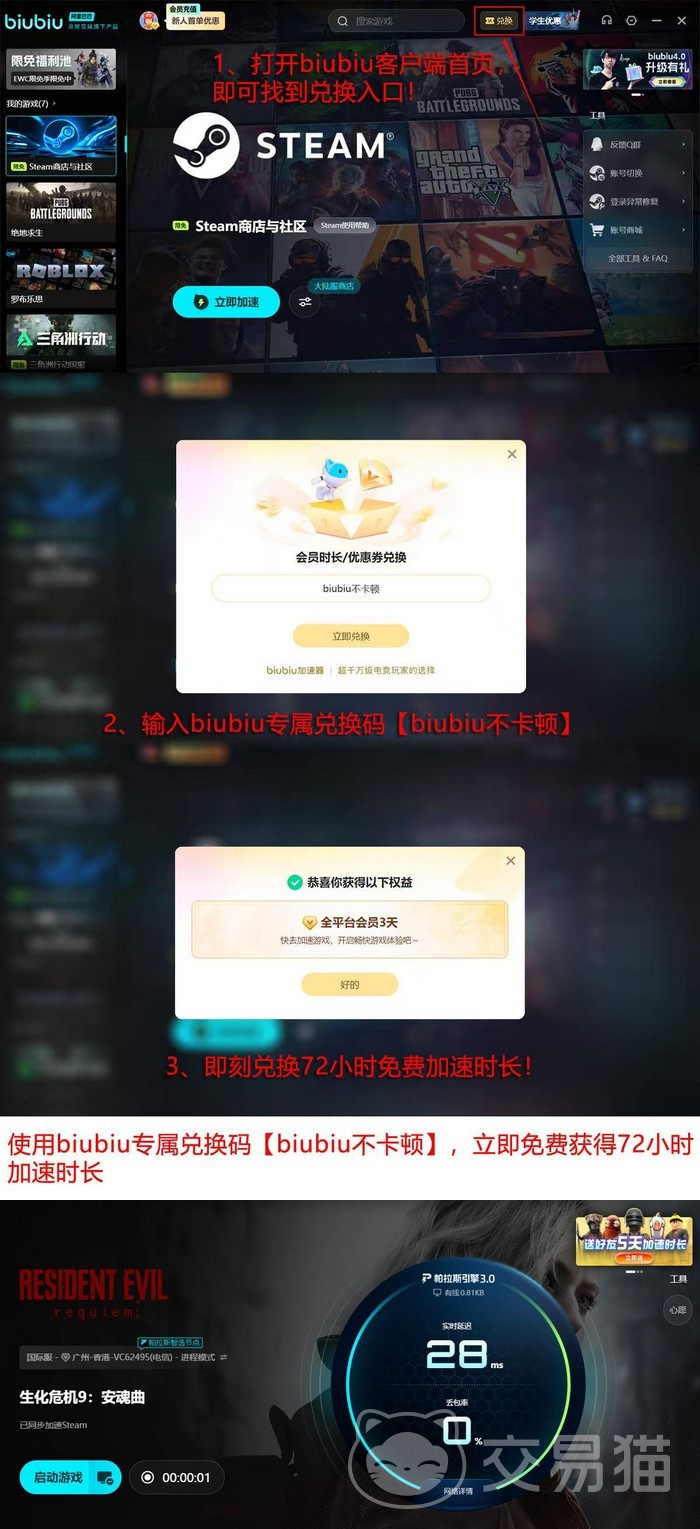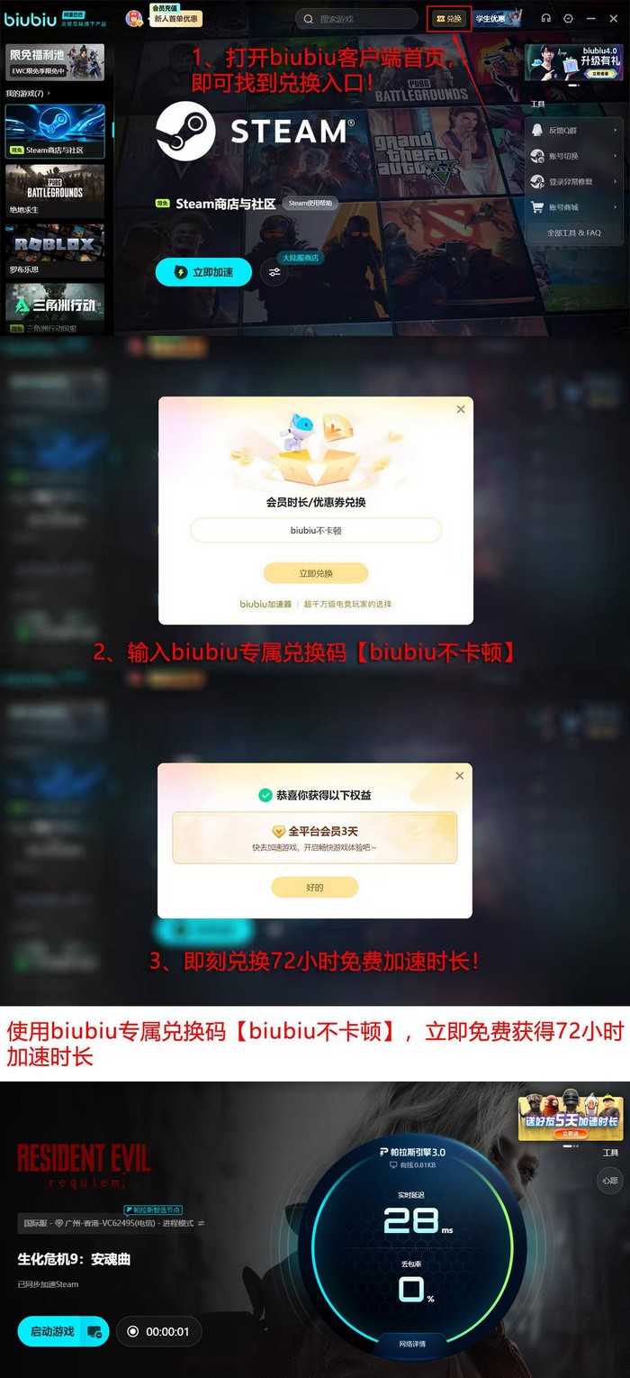 新老用户均可享受双重福利叠加:输入口令“biubiu不卡顿”,即可领取3天全平台高级会员;新用户完成注册后,系统自动发放24小时免费加速时长。两项权益可同步生效,新用户首期实际可享总计96小时加速服务。