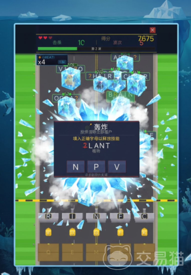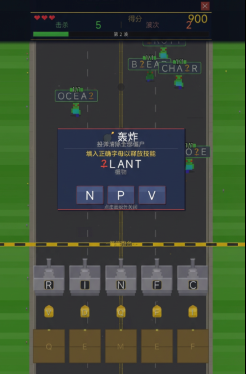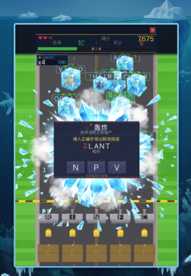 游戏采用“字母炮台+填空关卡”双轨驱动模式:玩家需根据屏幕提示的残缺单词,快速调用对应字母模块进行精准填充,命中正确答案后方可触发攻击。该机制要求玩家兼顾反应速度、拼写准确率与词汇储备量,显著提升了认知参与度。当连击数持续累积,系统将解锁冰冻、范围轰炸等战术技能,进一步强化战斗策略维度——这不仅是手眼协调的考验,更是词汇即时调用能力的实战检验。