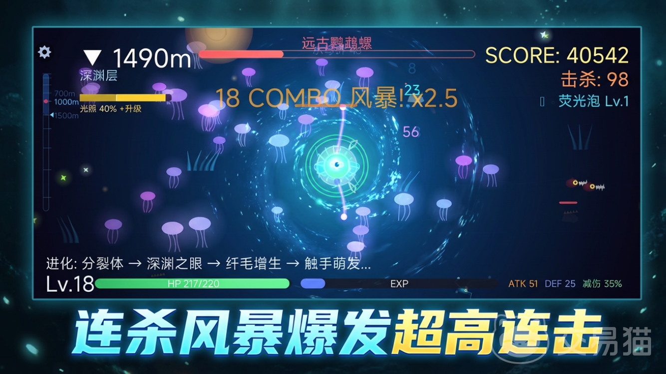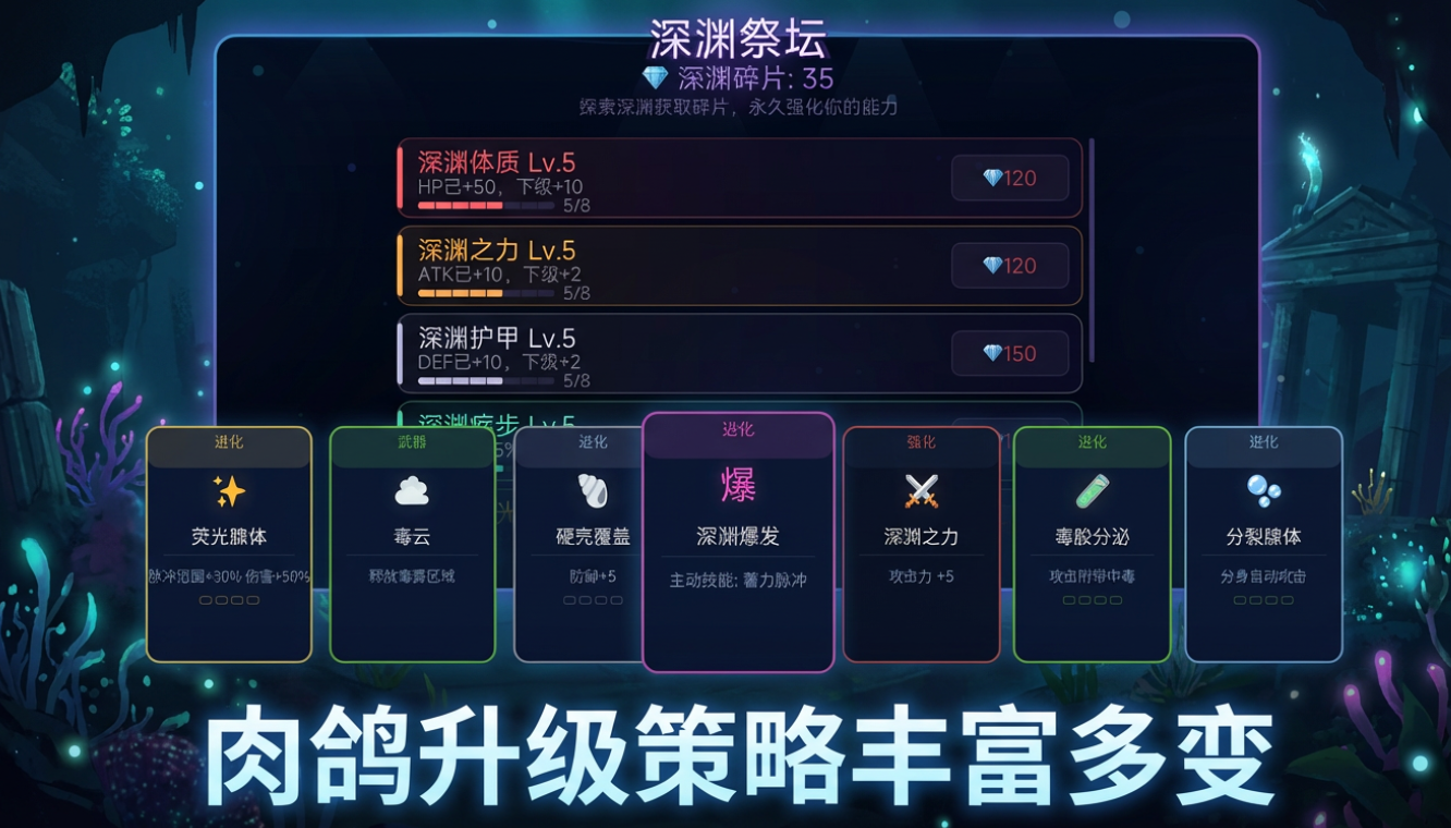 核心玩法强调决策权重:每一次进化分支不仅改变外观与基础属性,更重构战斗逻辑。选择毒素路线后,部分精英敌人会衍生抗性机制;专注荧光脉冲则可能触发特殊环境事件——如激活沉没灯塔引发全图照明,短暂压制阴影系生物。这种强关联性设计,确保百名玩家培育出的深海主宰绝无雷同。
