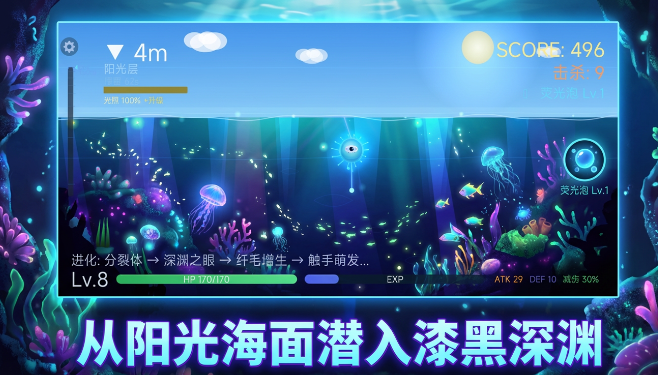 《荧光深渊》是一款聚焦深海生态与自主进化的策略型动作RPG。游戏以真实海洋生物学为灵感,构建出层次丰富的海底演化树系统。玩家从单细胞发光体起步,通过战斗积累能量,触发关键进化节点——每次升级提供四项不可逆路径:触手强化(高爆发近战控制)、甲壳增生(极限防御与抗性堆叠)、毒素腺体(持续伤害与群体削弱)、荧光脉冲(全屏范围激光打击)。路线选择直接影响后续敌群配置、关卡难度曲线及终局形态上限。