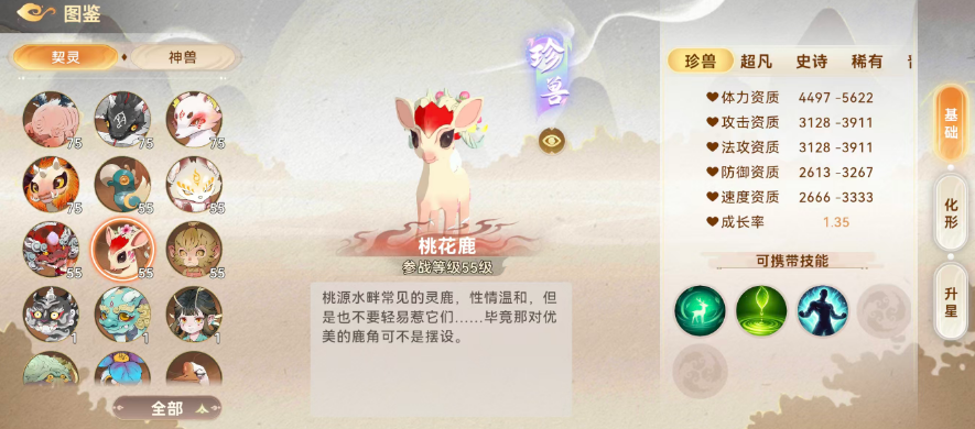 契灵配置方面,建议优先补足队伍续航短板。桃花鹿为首选治疗型契灵:可为3名友方回复相当于其法术攻击72%的生命值,并为主目标额外赋予“复苏”效果;死亡后有约5%概率复活,复活后立即恢复满生命,但整场战斗仅限触发1次。若需兼顾生存与输出压制,苍枢更为适配:可无视目标10%法术防御,对4名敌人造成约65%法术伤害,并有概率附加“潮湿”状态,降低敌方5%防御;同时具备与桃花鹿相同的复活机制,进一步提升容错上限。副契灵可根据玩家实际持有情况灵活选用,确保阵容完整即可。