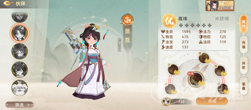 为弥补纯控场输出不足的问题,建议搭配物理爆发型角色离珠。该角色品质为优品,核心技能为三连击,每次造成90%+140点物理伤害,并附加50%生命吸取效果;但使用后需休息一回合,且冷却时间长达6回合。另一常用技能为:当自身先发速度达15点时,可发动双次攻击,每次造成70%+120点物理伤害;同时激活被动——物理攻击力永久提升2%;另一被动则依据已损失生命比例,提供15%至30%区间浮动的伤害吸血效果,显著增强持续作战能力。