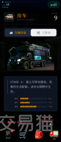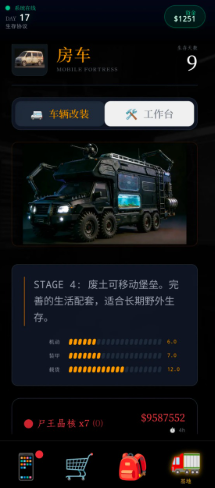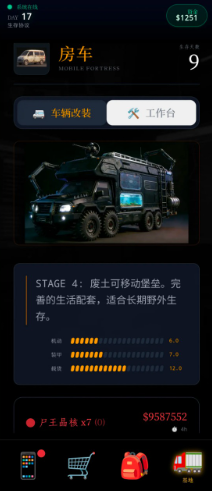 房车系统构成游戏核心成长线。初始仅是一台功能简陋的二手面包车,通过探索废墟、完成事件任务或拆解废弃载具,逐步解锁装甲模块、净水装置、太阳能发电板、车载床铺及旋转机炮支架等数十种改造组件。每一次升级都会实时呈现外观与性能变化:车身从锈迹斑斑到覆甲森然,内部从空荡裸露到分区完备,最终演变为兼具防御力、续航力与生活舒适度的全功能移动基地。