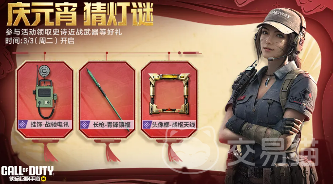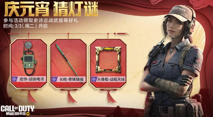 元宵灯谜活动于3月3日正式开放。玩家需参与灯谜问答,答对指定题目后可获得史诗级武器【长枪·青锋镇福】及其他道具奖励。该玩法融合传统文化元素,题型设计兼顾知识性与趣味性,相较常规签到更具参与感,适合碎片化时间体验。
