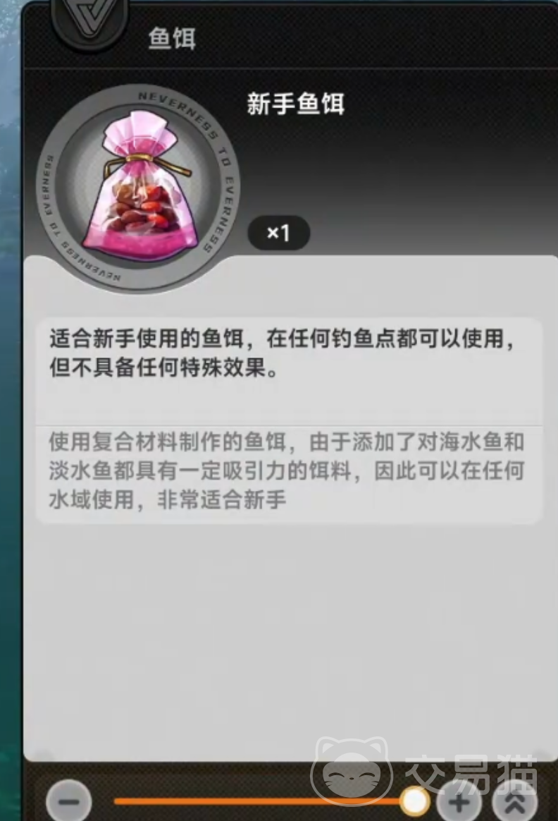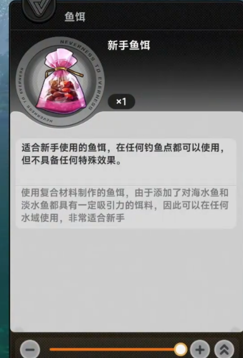 新手鱼饵是入门阶段的基础配置,具备全水域兼容性,既适用于淡水区域,也适配海水环境。其配方采用多鱼种适配型复合成分,无需针对特定钓点做前置分析即可直接使用,操作门槛低、上手快。该饵料对黑纹水虎、活翡翠、水下彩、牙巴拉、鹤顶红等目标鱼种无额外加成,稀有鱼出现概率维持基准水平。因此,它主要服务于新手熟悉钓鱼交互逻辑、掌握地图水域分布规律的过渡阶段,不建议长期用于高价值目标捕获。