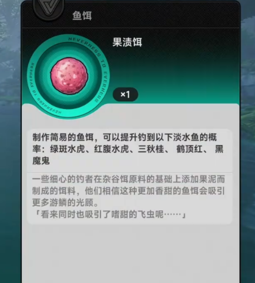 果渍饵是在杂谷饵基础上添加果泥调制而成,气味更浓郁、诱食性更强。其作用对象覆盖绿斑水虎、红腹水虎、三秋桂、鹤顶红与黑魔鬼等淡水鱼种,其中鹤顶红同时响应杂谷饵与果渍饵,印证其生态适应性较广。该饵料面向中等熟练度玩家设计,在追求高效率垂钓或定向收集珍稀图鉴鱼类时表现突出。合理匹配目标鱼种与对应饵料类型,能有效减少无效投饵次数,优化整体资源投入产出比。