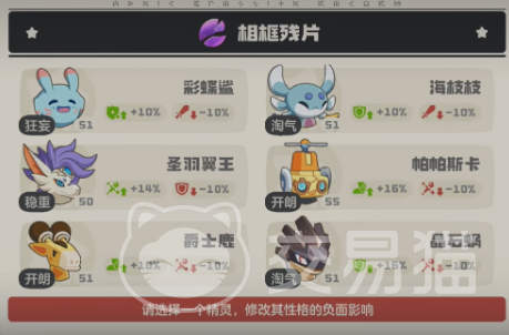 核心道具为“相框残片”,该物品专用于定向优化性格属性分布。需特别注意:相框残片仅支持修改性格中的减益项(即被削弱的能力),而增益项(即被强化的能力)一经确定则不可变更。举例说明:若精灵为胆小性格,其固定增益为速度+,固定减益为物攻−;使用相框残片后,可将“物攻−”替换为“魔攻−”,但“速度+”始终保留。同理,若目标是打造固执性格精灵,则必须初始获取具备“物攻+”增益的个体,无法通过相框残片新增该增益。