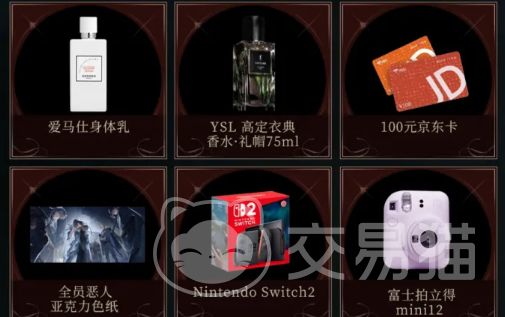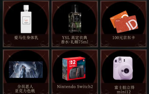 本次福利体系覆盖维度广泛,除勋章外,还设置多档高价值实物大奖。头奖为Nintendo Switch2主机,具备主流性能与便携体验;针对美妆爱好者,特别配置高端礼遇组合:定制香水、香奈儿唇膏、爱马仕身体乳,三款均为国际一线品牌正品;影像类实用奖品包含富士拍立得相机,便于即时留存生活片段;基础通用型奖励为100元京东卡,适用范围广、兑现便捷;此外,还有《全员恶人》IP专属周边,满足核心玩家的收藏需求。