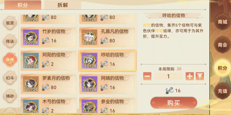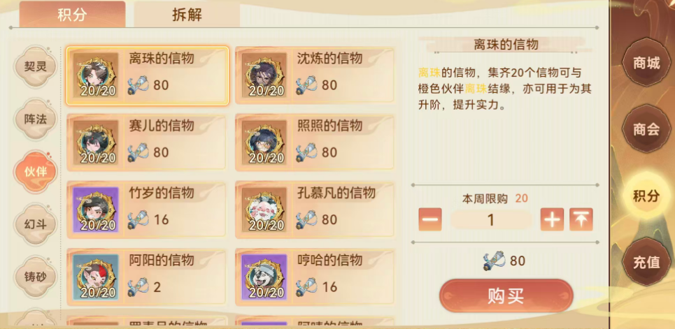 除用于结缘外,信物同样是伙伴后期升阶不可或缺的消耗材料。随着伙伴等级提升与阶位突破,所需信物总量将大幅增加,对玩家的长期资源储备能力提出更高要求。若某位伙伴已不再纳入主力阵容,其对应信物亦可进行拆解,转化为通用货币,用于商城内其他资源的兑换。目前,所有伙伴信物的唯一获取渠道为游戏内“商会”系统——该系统不开放副本掉落、活动直赠等替代路径,确保了信物获取逻辑的统一性与策略性。