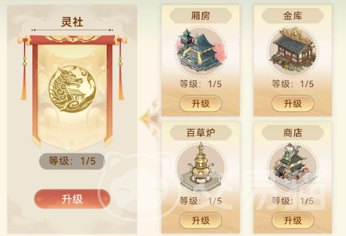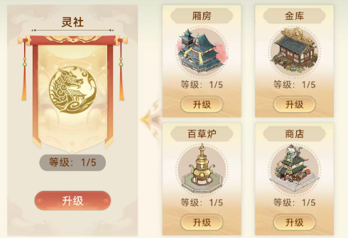 灵社的建设由具备管理权限的成员主导,包括社长、司命等职务角色;普通社员无权操作建筑升级。当前可建造并升级的设施共四类:厢房(提升成员容量)、金库(增强资源存储)、百草炉(支持炼药相关产出)及商店(核心兑换枢纽)。其中,商店等级直接影响可兑换道具的稀有度与实用性——高等级商店不仅开放更多专属物品,部分关键养成材料仅限灵社商店获取。需注意:建筑升级为单线程操作,同一时间仅能进行一项升级,且每次升级耗时各异。