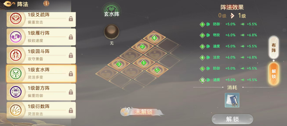 强调战术灵活性的阵容推荐玄水阵:该阵独设一名突袭位角色,获得5%速度加成,专司先手压制;辅助角色被置于侧翼,获得高额法术攻击加成;前排角色则获得6%物理攻击提升;主角防御提升5%。整体布局兼顾突进、承伤与输出,角色职能边界清晰,配合空间广阔。