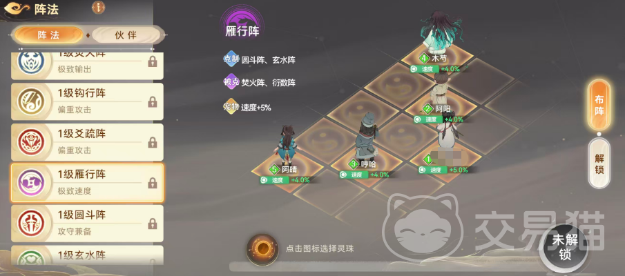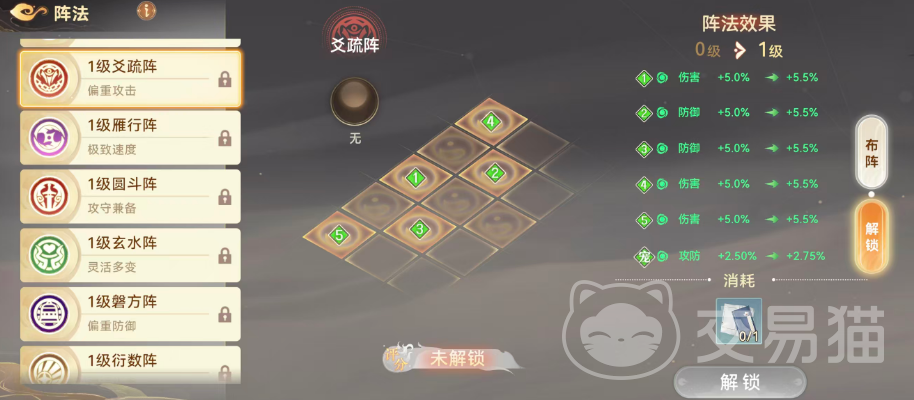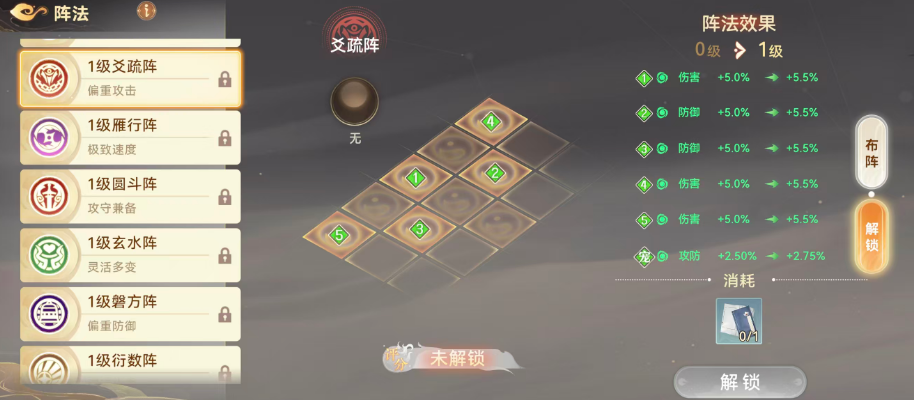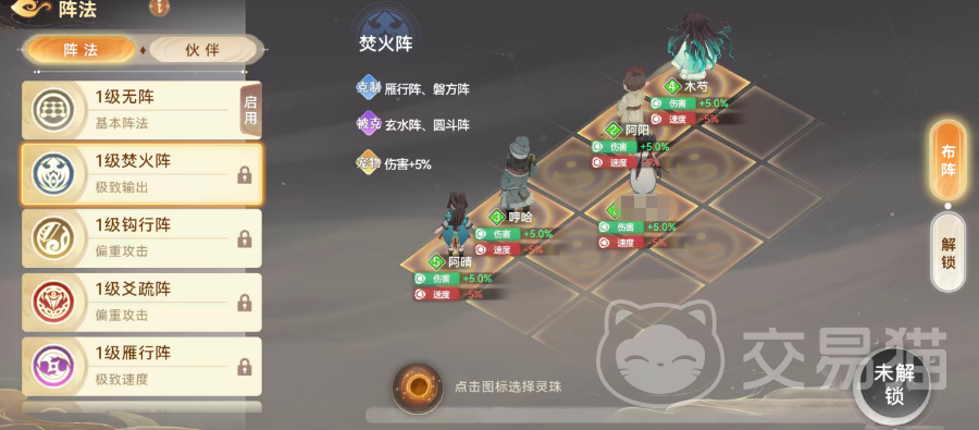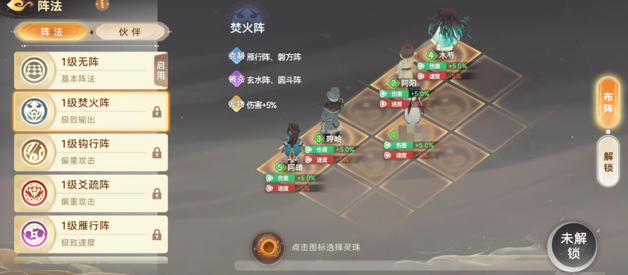 焚火阵克制雁形阵与磐方针,但自身被玄水阵、圆斗阵反制。启用该阵时,宠物伤害提升5%。随着阵法等级提升,其基础加成与克制压制力同步增强,升级需消耗对应名称的阵法书。当阵法达到高等级并解锁灵珠槽位后,玩家可镶嵌灵珠进一步拓展属性维度。若侧重爆发输出,钩行阵与爻疏阵是优选:钩行阵为全体伙伴提供4.2%增益,辅助类角色获4%加成;爻疏阵则给予伙伴5%加成,宠物获得2.5%攻防提升——综合来看,爻疏阵在角色本体战力强化上更具优势。