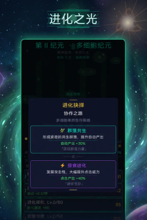 BEASTAGES2026、DDFPYPT、SHJIRND——以上三组兑换码均为近期有效且热度较高的官方发放代码。兑换后可获得进化加速卡与能量补给道具,适用于不同阶段的玩家:新手能借此平稳度过发育初期,资深用户则可通过提升轮回效率,加快文明跃迁节奏。游戏最突出的特点在于其具象化、可视化的演化路径——从最基础的氨基酸分子起步,逐步演化为海洋原生生物,最终迈向星际文明形态。每个关键节点的转变都清晰呈现,带来沉浸感十足的成长体验。