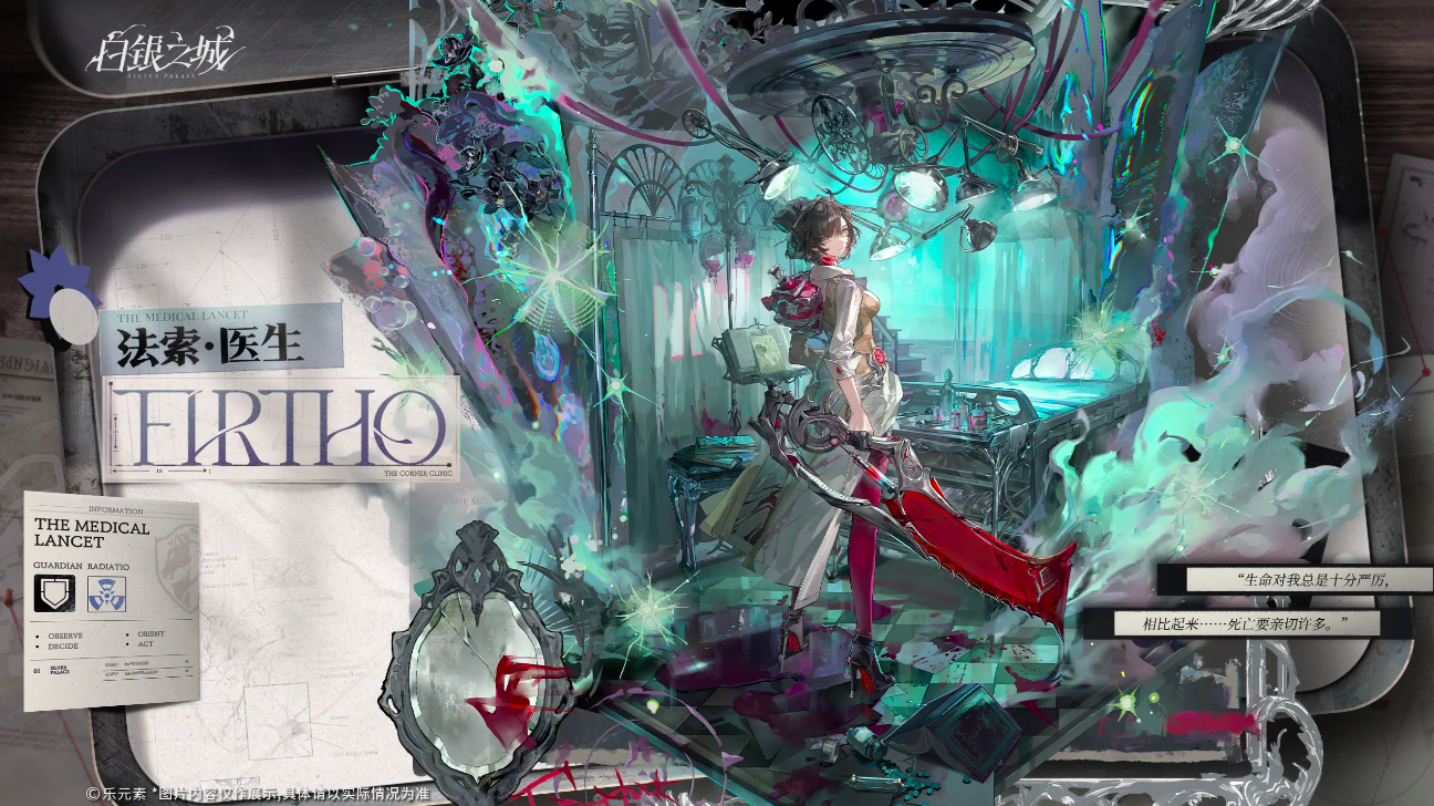 第二位是法索医生,一位兼具高治疗输出与战术压制能力的复合型支援角色。她长期驻守于私人诊所密室,专注前沿医学研究,所有技能设计均围绕临床医学概念展开。其战斗机制强调精准打击与状态干预,“长城”为其标志性高伤技能。角色设定中明确存在先天性生理缺陷,依赖外置维生装置维持生命体征;性格上排斥怜悯,抗拒被视作负担,因此深化角色关系的关键路径在于赋予其前线作战职责。