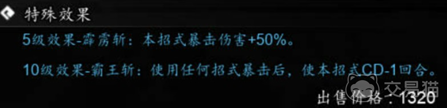 技能成长路径清晰明确:升至5级时激活“霹雳斩”,触发暴击时额外造成50%伤害加成;达10级后解锁“霸王斩”,当其他招式命中并暴击时,霹雳霸刀冷却时间减少1回合。双重强化机制使该武学从单次爆发进阶为可持续压制体系,完美契合刀法流派对节奏掌控与连续压制的需求。