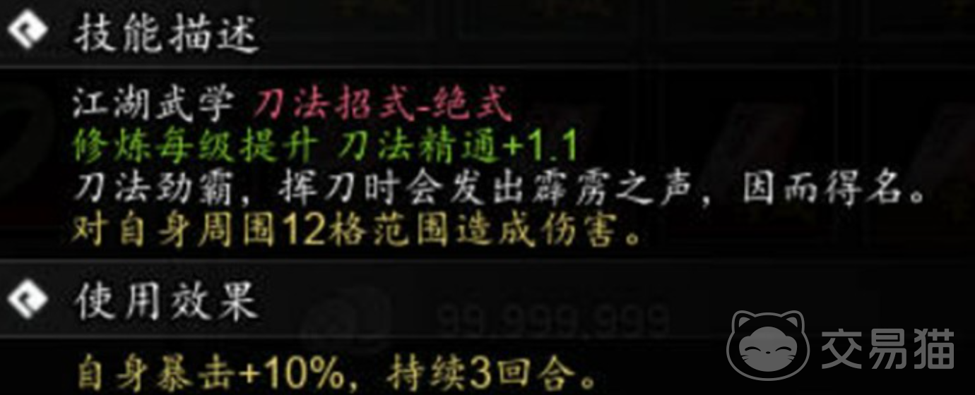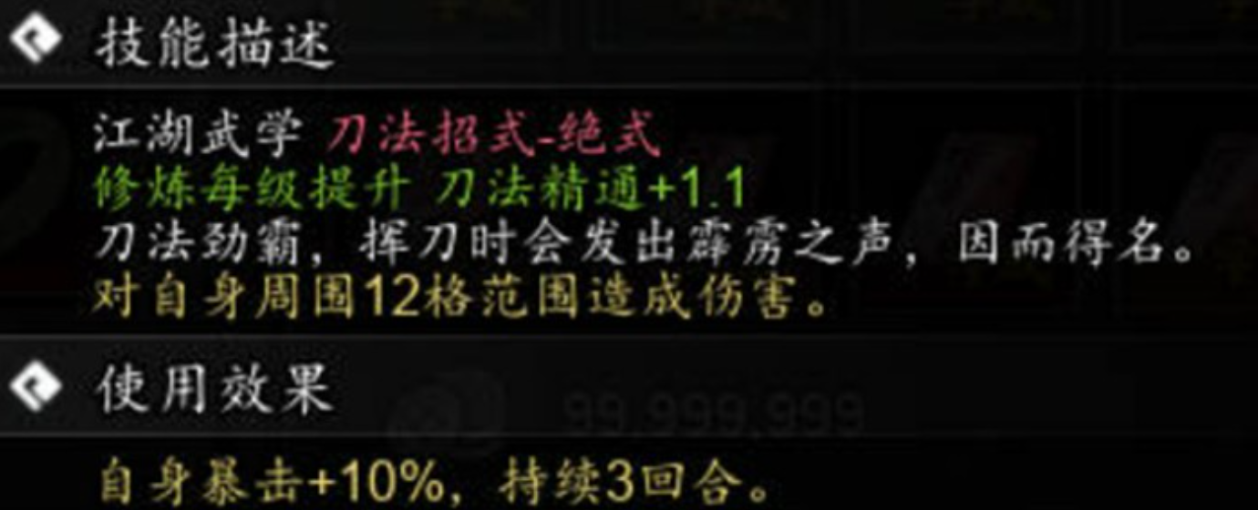 该武学为范围型攻击技能,生效半径覆盖周身12格内所有目标,单次施放消耗392点真气,冷却时长为4回合。除稳定AOE输出外,其核心机制在于战后增益:成功释放后,主角将获得持续3回合的暴击率+10%效果。这一被动显著提升后续攻击的不确定性压制能力,在对抗高血量Boss或精英怪时,可有效压缩战斗节奏,提升通关效率。