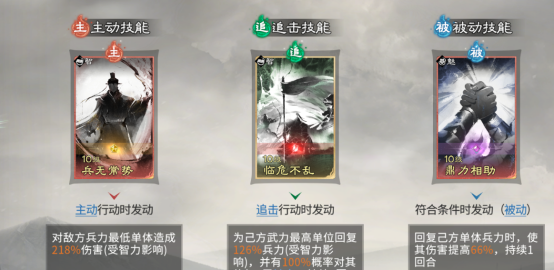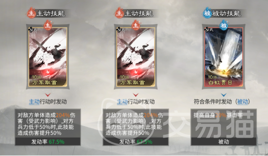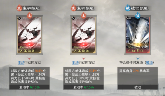 技能配置方面,甘宁主动技必选【万军取首】,该技能基础倍率优异,且对兵力低于50%的目标存在额外伤害加成,兼具爆发与收割双重特性;追击技无需额外装配;被动技首选【白虹贯日】,提供20%暴击率提升,有效缩短技能循环,加速高频高伤输出节奏。