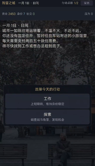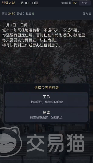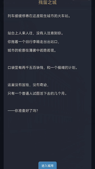 《残留之城》公测时间尚未正式公布,这款以文字叙事为核心的生活模拟类冒险游戏,采用多周目循环机制,玩家将扮演初抵陌生城市的主角,仅携2500元现金与一只行李箱,在高压现实环境中求职、租房、维系人际关系,并通过每一年的关键抉择影响后续进程。游戏内所有选择并非孤立存在,其后果将以“残留”形式沉淀至下一循环,构成层层递进的叙事逻辑与策略深度。