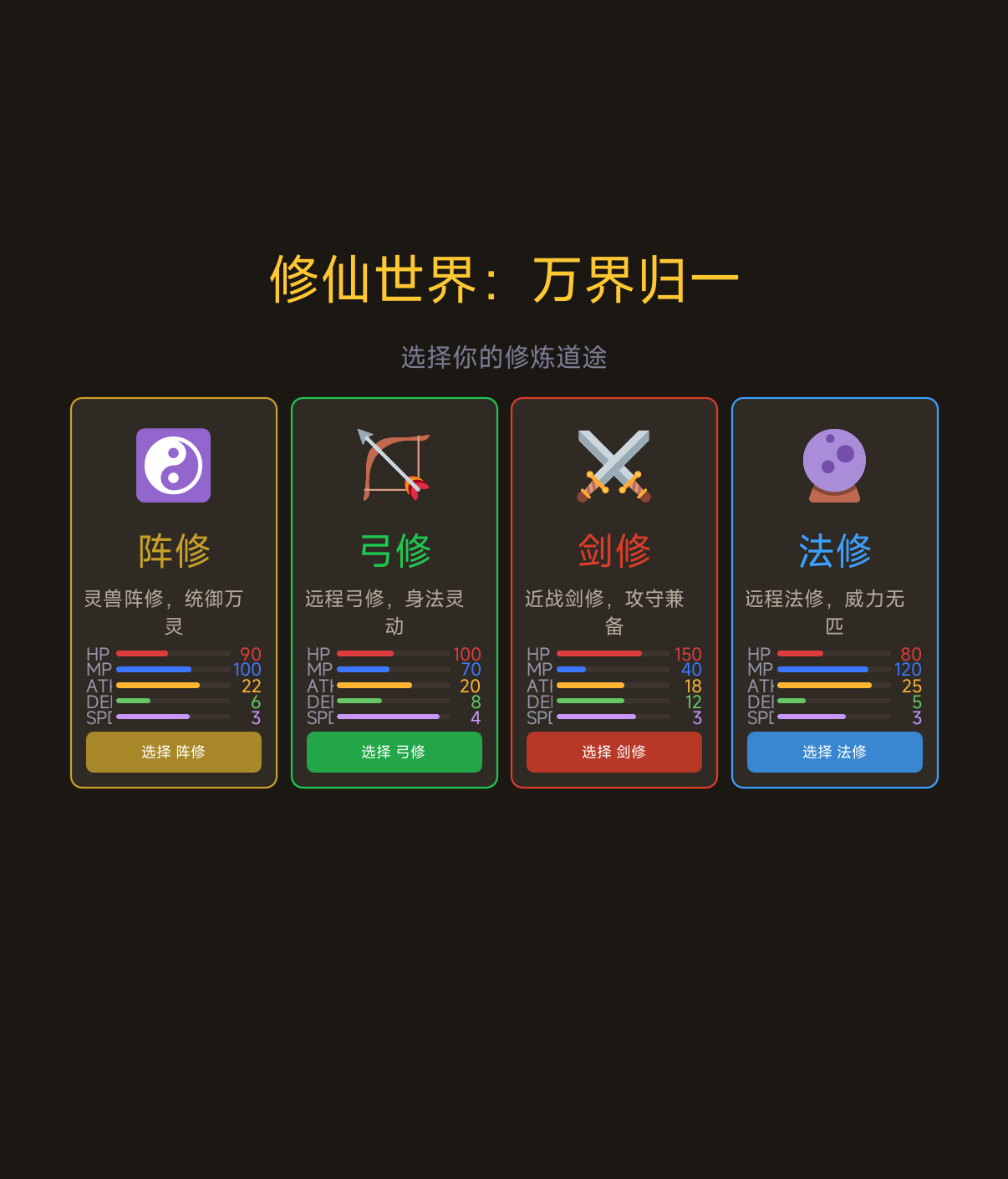 游戏采用模块化设计,主界面清晰展示全部功能板块。角色创建阶段提供四大职业选择:法修、剑修、弓修、阵修,选定后即刻进入地图。战斗全程自动运行——角色自动寻敌、触发战斗、战败后原地复活,并进入固定时长的恢复等待期,真正实现“挂机即成长”。