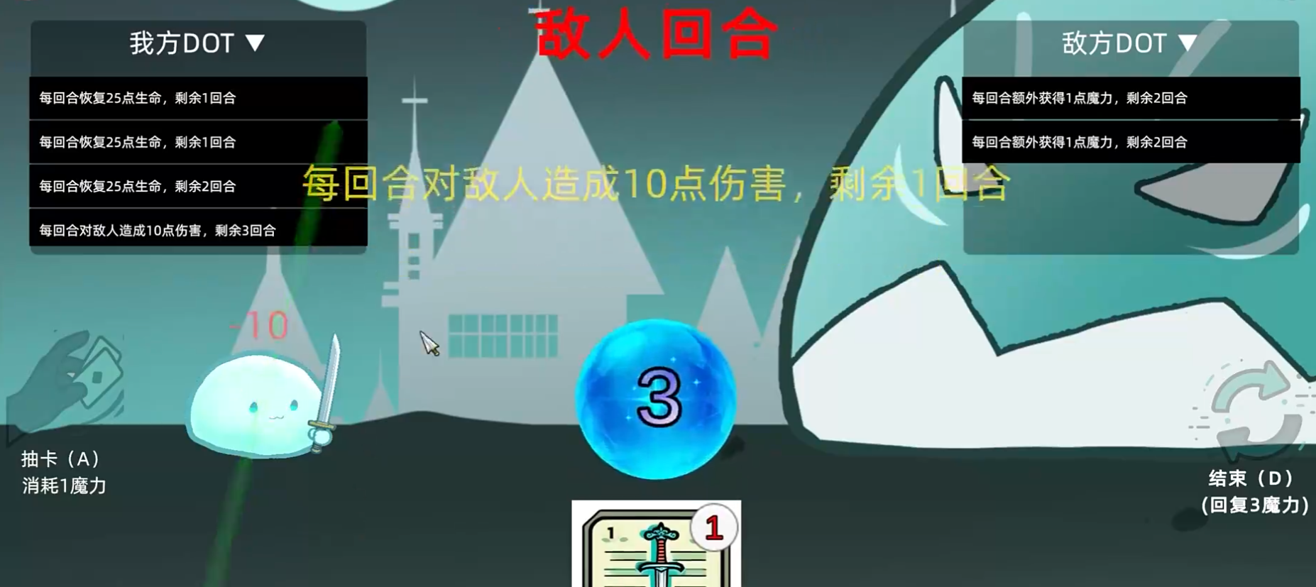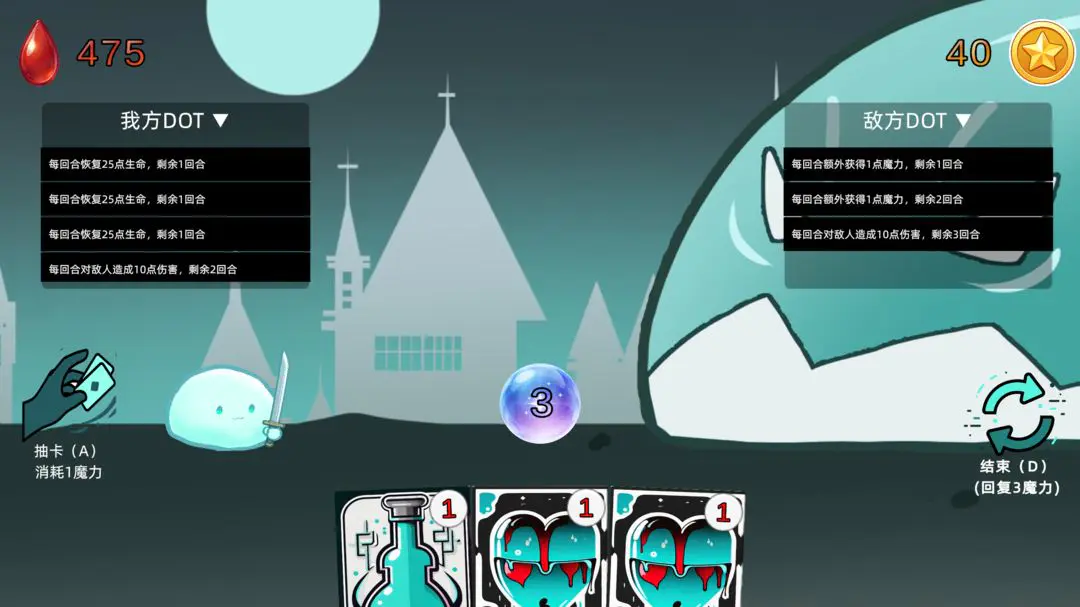 本作采用标准回合制卡牌对战框架。每回合魔力自动恢复,玩家与Boss交替行动。战斗节奏强调资源规划与状态管理——需合理分配手牌,组合使用35张功能各异的卡牌,覆盖DOT施加、爆发输出、资源调度及特殊反转效果等多个维度,形成多层次策略博弈。