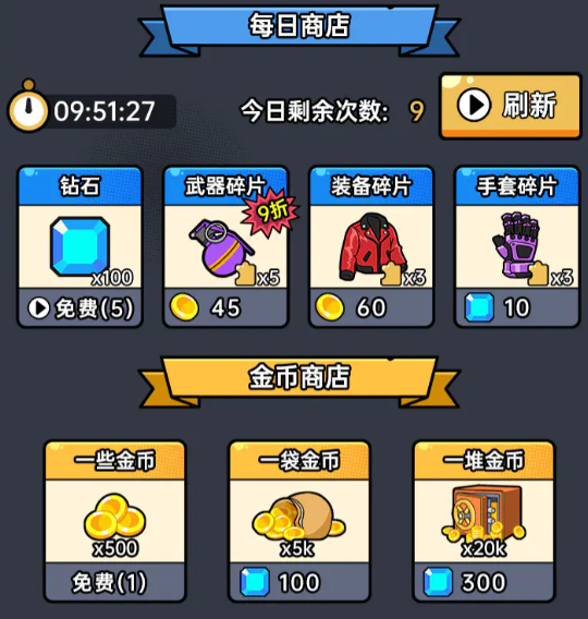 针对战力成长较慢或资源储备不足的情况,游戏内设每日刷新的限时商店。其中包含武器碎片、服装碎片等关键养成材料,部分道具还可免费领取,助力玩家高效构建核心战力体系。