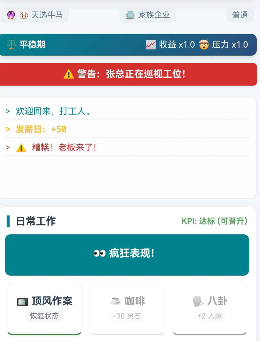 《大厂修仙传-打工人飞升模拟器》将当代职场生态与东方修仙世界观深度交织,构建出独具张力的模拟经营体验。玩家不再以传统“修士”身份入场,而是化身初入名企的实习修士,在格子间布阵、在会议室炼丹、于OKR系统中参悟大道——核心成长路径围绕突破KPI桎梏展开,逐级晋升至部门负责人、事业部总监,最终执掌企业战略决策权。任务体系高度动态化,涵盖跨部门协作劫难、季度复盘心魔、竞标项目雷劫等多元挑战,形成强代入感与持续性成长反馈。