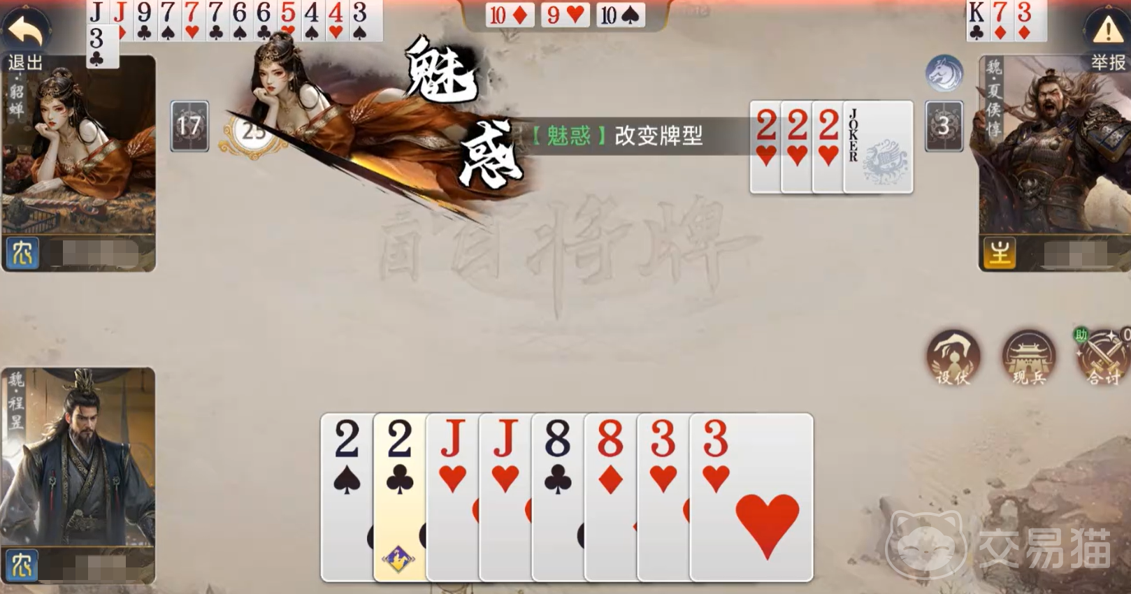 从战术定位来看,貂蝉属于典型的“非对称支援型武将”。她不依赖单点击杀,而是通过持续施加决策压力,迫使对手在出牌选择上不断妥协:或放弃连招完整性,或提前暴露关键底牌,或打乱既定配合节奏。在五人斗地主模式中,这种影响呈指数级扩散——当敌方多角色依赖协同出牌时,一次成功的魅惑往往能瓦解整条进攻链条,使战场主动权悄然向我方倾斜。