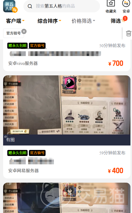 很多人想要退坑,但不知道第五人格账号卖多少钱好点。这时安卓用户可通过上方按钮,即可获取交易猫app,打开后就能使用估值功能,若是该游戏不支持的话,也可找到第五人格专区,看跟自己差不多价值的商品标多少,然后自己也卖个差不多的价格就好。要是iOS用户的话,就只需要在线打开交易猫官网就好,同样可以完成估值。