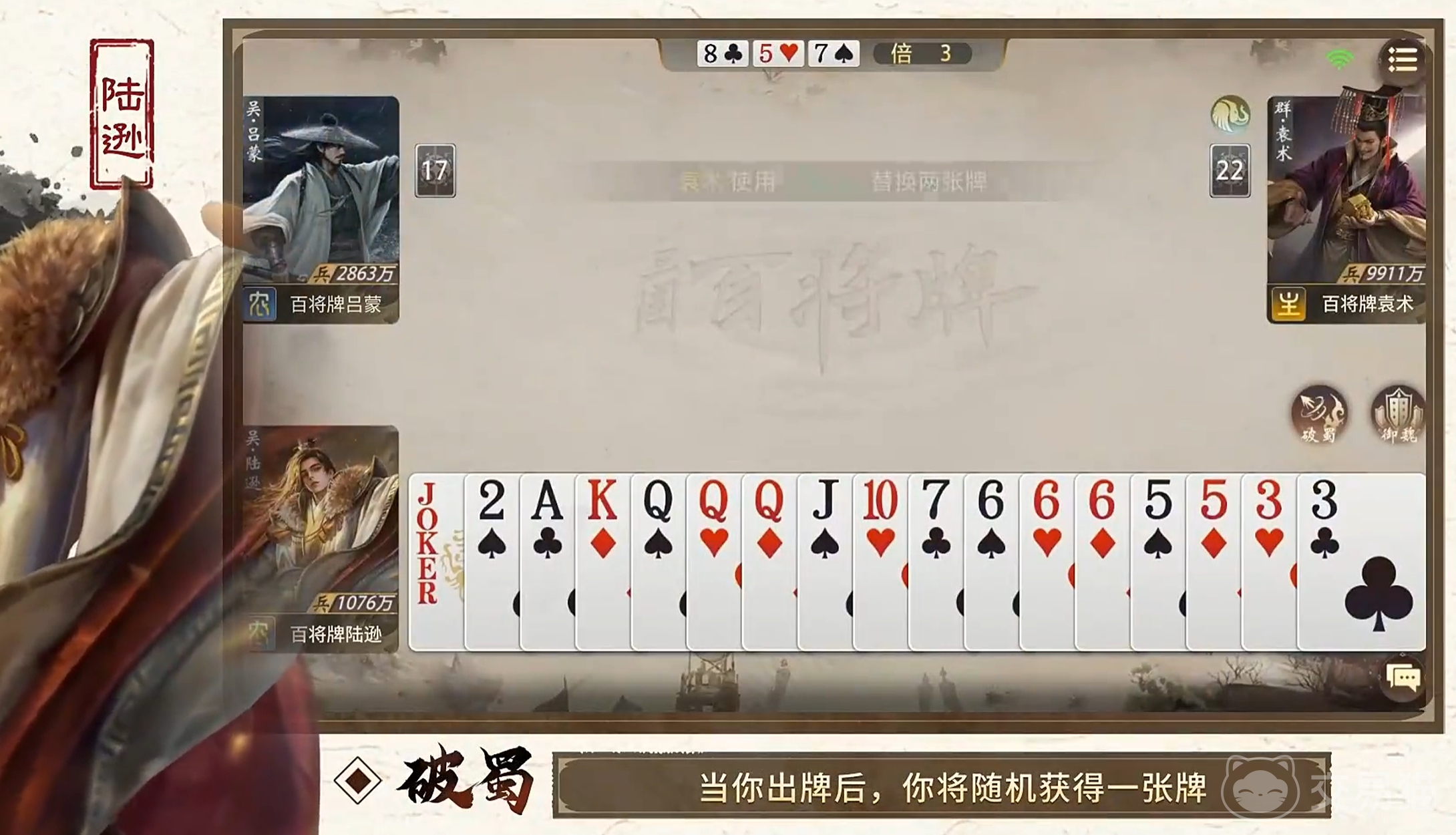 第一项机制强调“动态补强”。每当陆逊完成一轮连续出牌(即未被中断),系统即为其随机补充一张点数不低于10的牌。该效果不依赖特定牌型或次数门槛,仅需保持出牌连贯性即可稳定触发。这一设定既缓解了前期低点数牌消耗带来的资源压力,又为构建炸弹(四张相同点数)、顺子(五张及以上连续点数)等高阶组合提供持续支撑。实战中建议优先使用3–8点区间的小牌试探对手响应模式,同步优化手牌结构,避免过早暴露关键大牌。