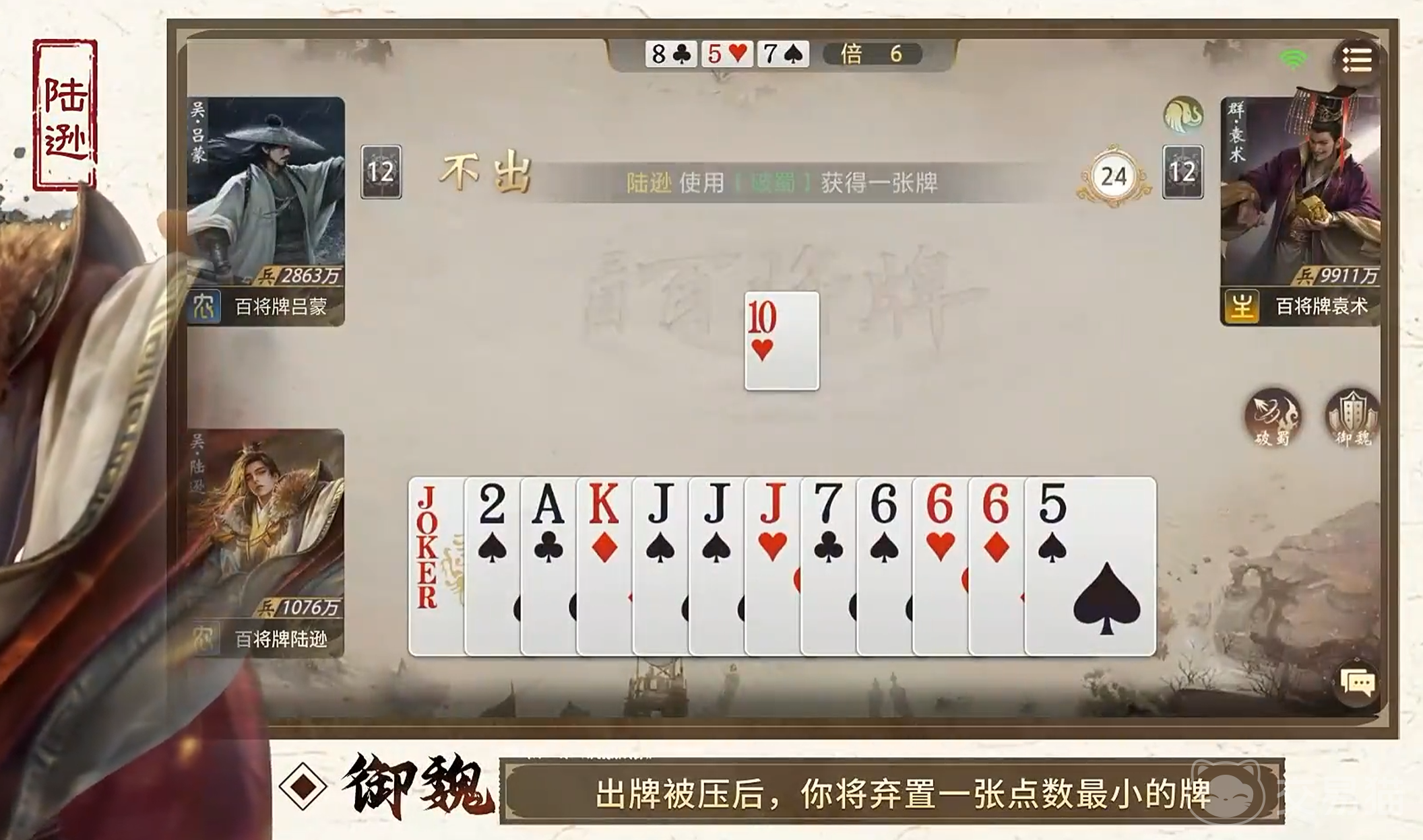 第二项机制体现“主动示弱”。当陆逊手牌无法压制当前出牌者时,系统将自动弃掉其手牌中点数最低的一张。该行为并非被动损失,而是通过可控的牌量削减,向对手传递模糊信号——既可能暗示手牌薄弱,也可能隐藏高点数组合。有经验的玩家会利用此特性刻意保留三带二、双顺等复合牌型,诱导对手提前使用大牌压制,从而为后续反制创造空间。结合第一技能的高点数补牌能力,陆逊可在弃牌后迅速恢复手牌质量,实现攻防节奏的无缝切换。