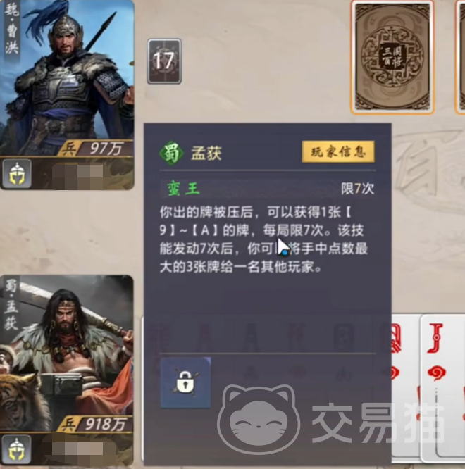 在《三国百将牌》中,孟获是一位机制独特、战术维度丰富的武将角色。其核心技能设计围绕“压制响应”与“阶段转化”两大逻辑展开:当玩家打出的牌被其他玩家成功压制时,立即获得一张点数为9、10、J、Q、K或A的牌,该效果单局最多触发七次;当第七次触发完成后,可将当前手牌中点数最大的三张牌,自由指定一名玩家进行转移。