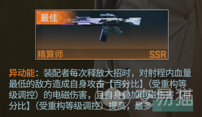 武器配置需紧密契合其叠加节奏。首选装备为“精算师”,可在大招释放时对低血量目标追加电磁伤害,并同步强化电磁增伤效果,显著提升多段输出效率;满层状态下伤害增幅尤为突出。备选方案包括侧重残局收割的“异动能”,以及适用于持久消耗战的“步步为营”。