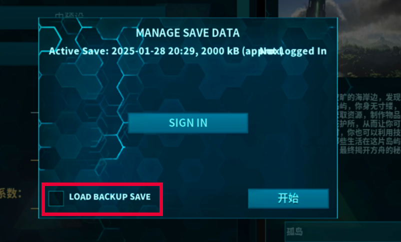 若首次生成的世界资源分布或生物刷新不符合预期,无需重装游戏。返回主菜单,再次进入“孤岛”地图设置页,在点击“开始单人游戏”前,请务必勾选左下角的“Load backup save”选项。该功能将强制调用最近一次自动保存的备份存档,而非生成全新世界。