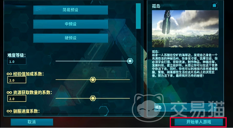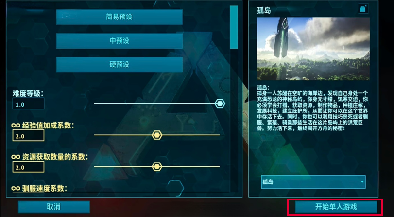 进入存档管理的第一步是启动单人模式。在主界面选择“单人玩家”,随后选定起始地图——以“孤岛”为例,点击进入后将跳转至世界设置面板。此处可调节经验值加成、资源采集倍率等关键参数,建议新手参考常规配置(如经验系数设为2.0,资源倍率设为3.0),确认无误后点击右下角“开始单人游戏”即可载入初始世界。
