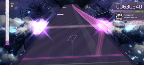 游戏采用双轨立体下落式判定体系:界面内设上下两条独立判定线,音符沿轨道垂直下坠,需在抵达对应判定线瞬间完成点击或滑动操作。误触、延迟或提前触发均将影响连击与分数表现。所有曲目均配备专属动态插画与定制化谱面动画,视觉节奏与音频波形深度耦合,强化沉浸感。剧情模块以“光与对立”为核心母题,采用非线性碎片化叙事,玩家通过解锁歌曲、收集角色档案、推进搭档故事逐步拼合世界观全貌。