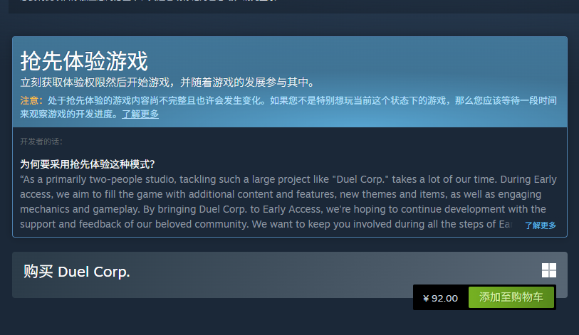 目前,《DuelCorp》在Steam商店标价为92元人民币,暂无任何促销或折扣活动。需特别说明的是,该价格对应的是“抢先体验版”(Early Access),并非最终正式版。官方尚未公布正式版定价策略,但根据同类独立动作游戏的发行惯例及开发周期预估,完整版售价区间预计为198至298元人民币。