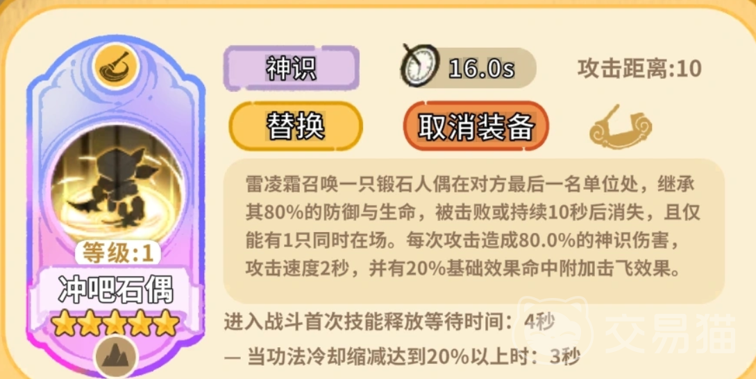 召唤流代表角色,擅长通过战术部署改变战场格局。“冲吧石偶”可召唤锻石人偶,精准落于敌方最右位单位处,继承其80%生命与防御属性,持续10秒或被击破即消失(场上仅允许存在1只)。该单位每次攻击造成80%神识伤害,并附带概率击飞效果,兼具干扰与持续压制能力。